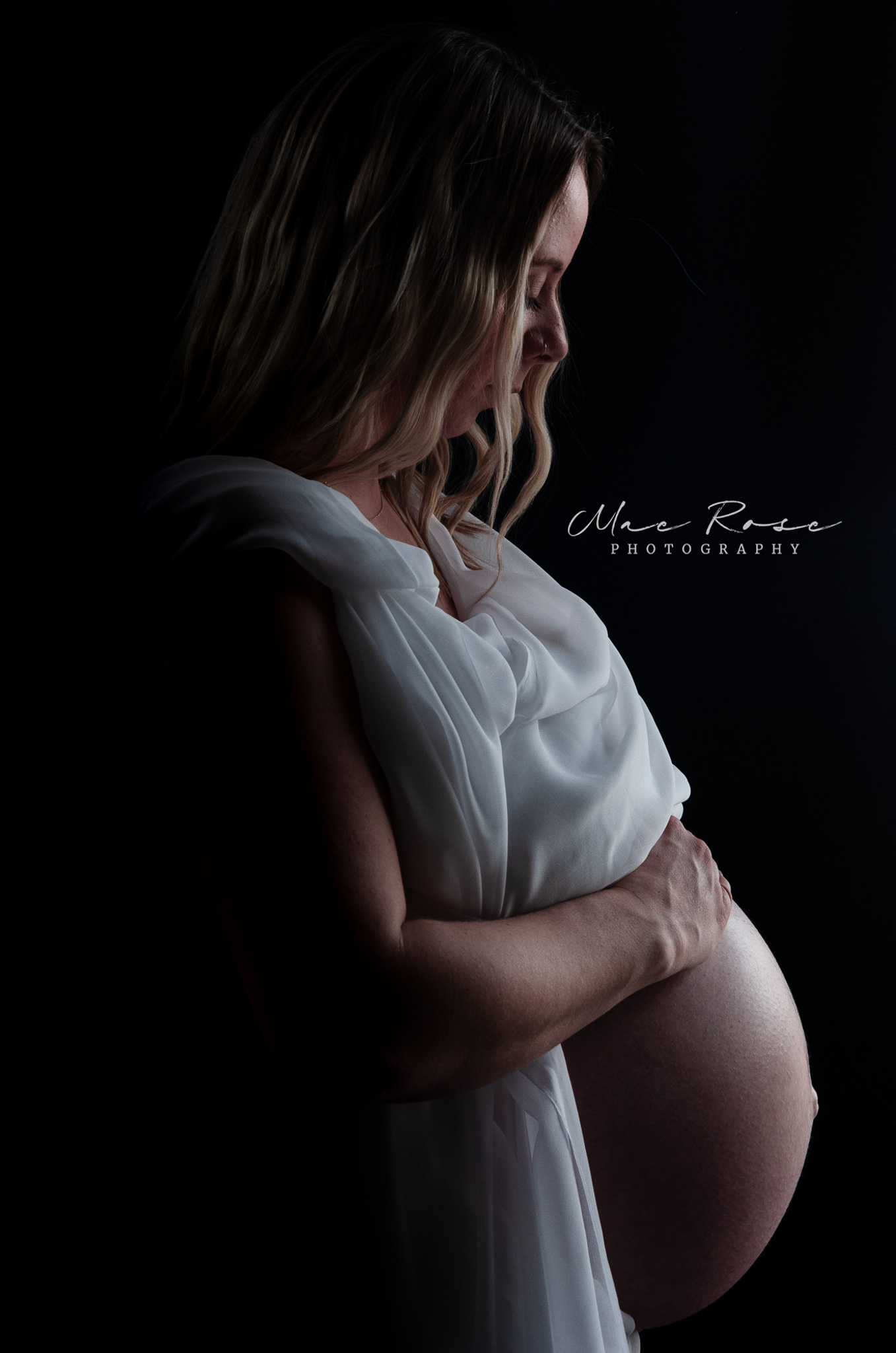 An elegant fine art portrait experience, capturing the grace and anticipation of motherhood with beautiful intention.